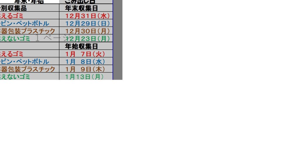 年末年始ゴミ出し日燃えるゴミ12月31日(水)缶・びん・ベットボトル12月29日(日)燃えないゴミ12月23日(月) 年始収集日ゴミ出し日燃えるゴミ1月7日(火)缶・びん・ベットボトル1月8日(水)燃えないゴミ1月13日(月)